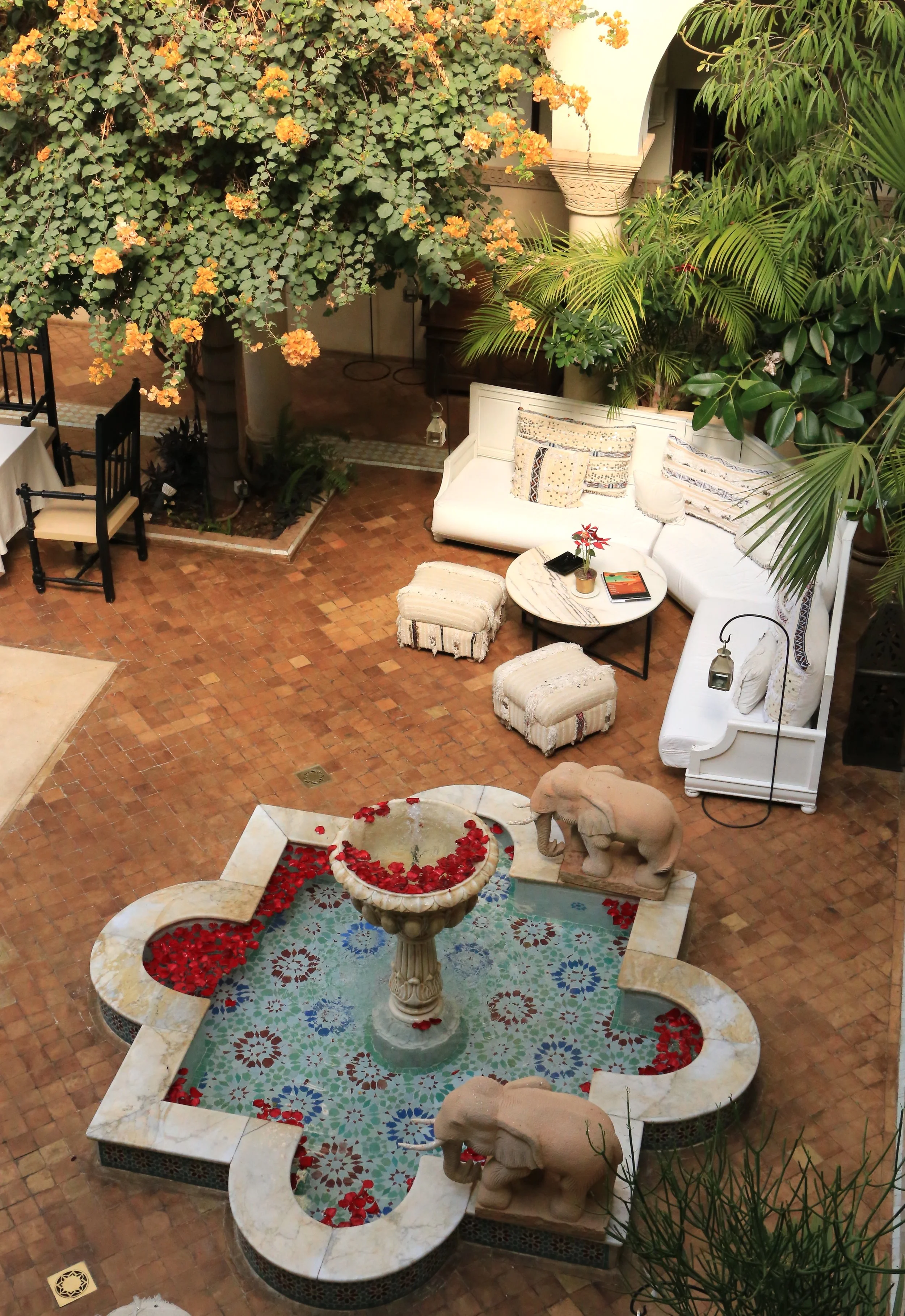 Upon entering Demeures D’Orient, guests are greeted by a vast, vaulted patio adorned with lush flora and a serene fountain. At the center lies a large heated pool, inviting visitors to unwind and escape the Moroccan sun. The riad's architecture reflects traditional Moroccan craftsmanship, with intricate tile work, carved wood accents, and rich textiles creating an ambiance of timeless beauty.