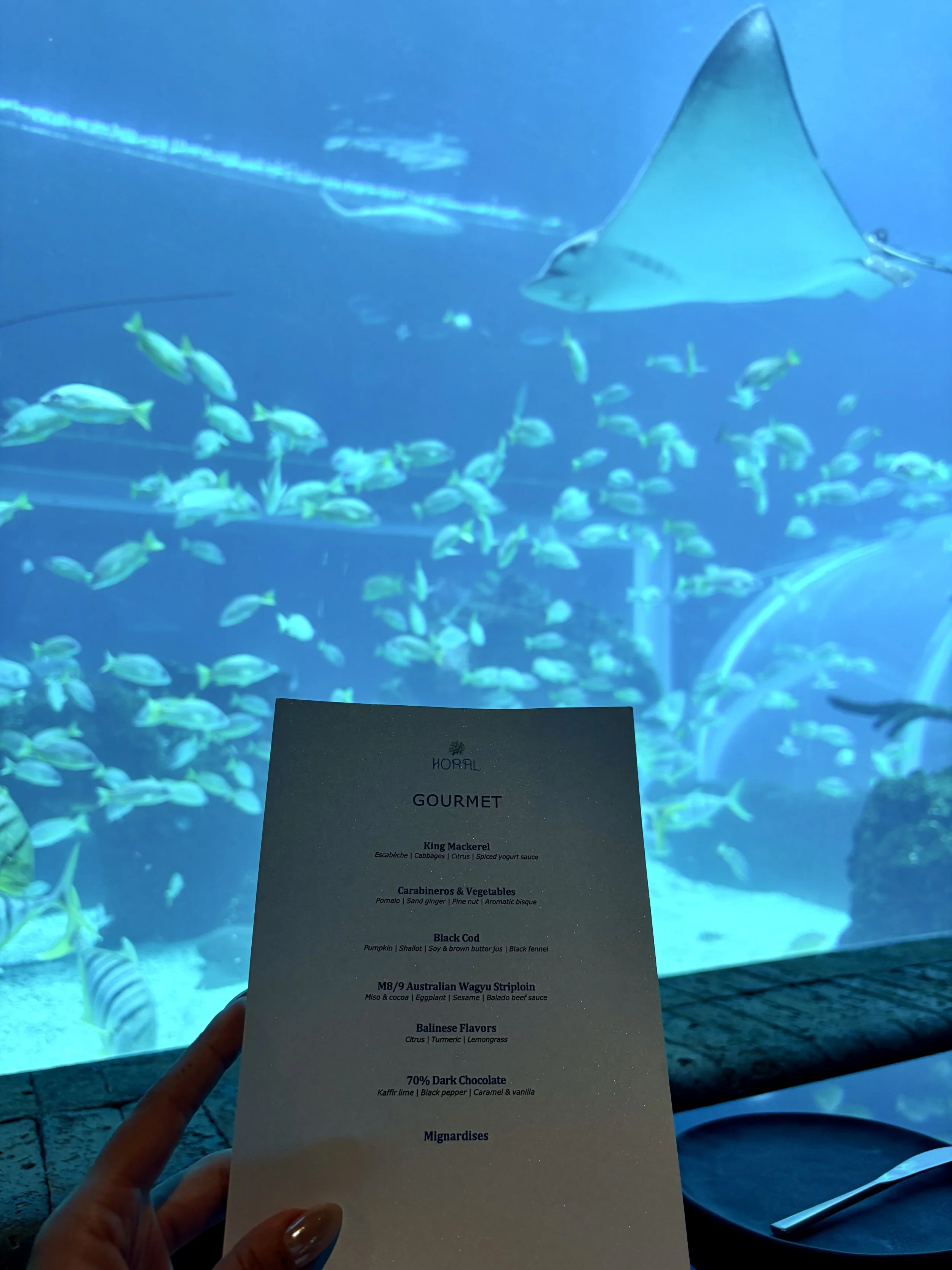Dining beneath a massive underwater aquarium while enjoying impeccably plated cuisine feels surreal. The atmosphere is elegant yet intimate, and the menu is refined, thoughtful, and beautifully executed.